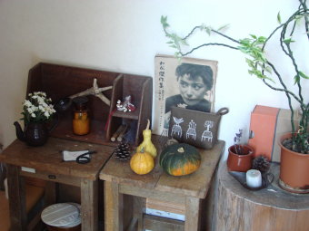 かぼちゃと一緒に秋の雰囲気いっぱいの玄関の様子です