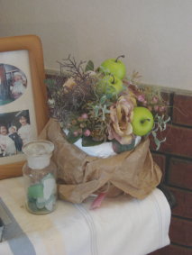 シャビーな雰囲気の造花のお花とグリーンのアレンジ